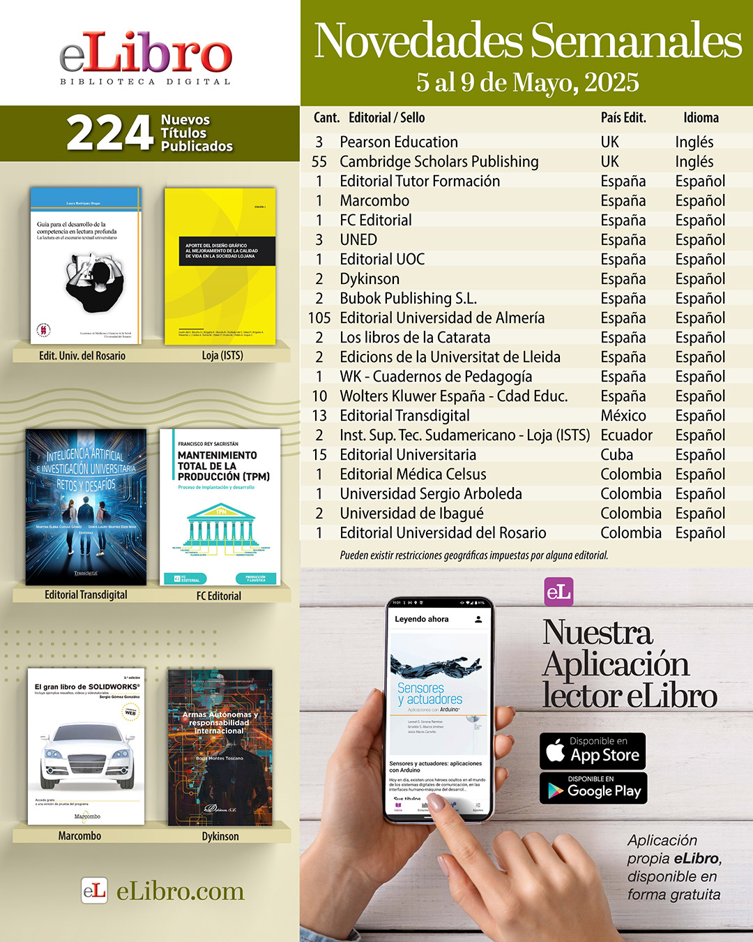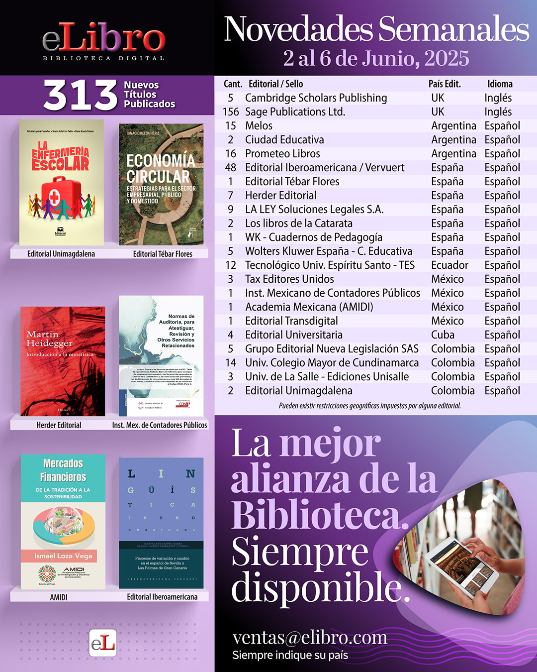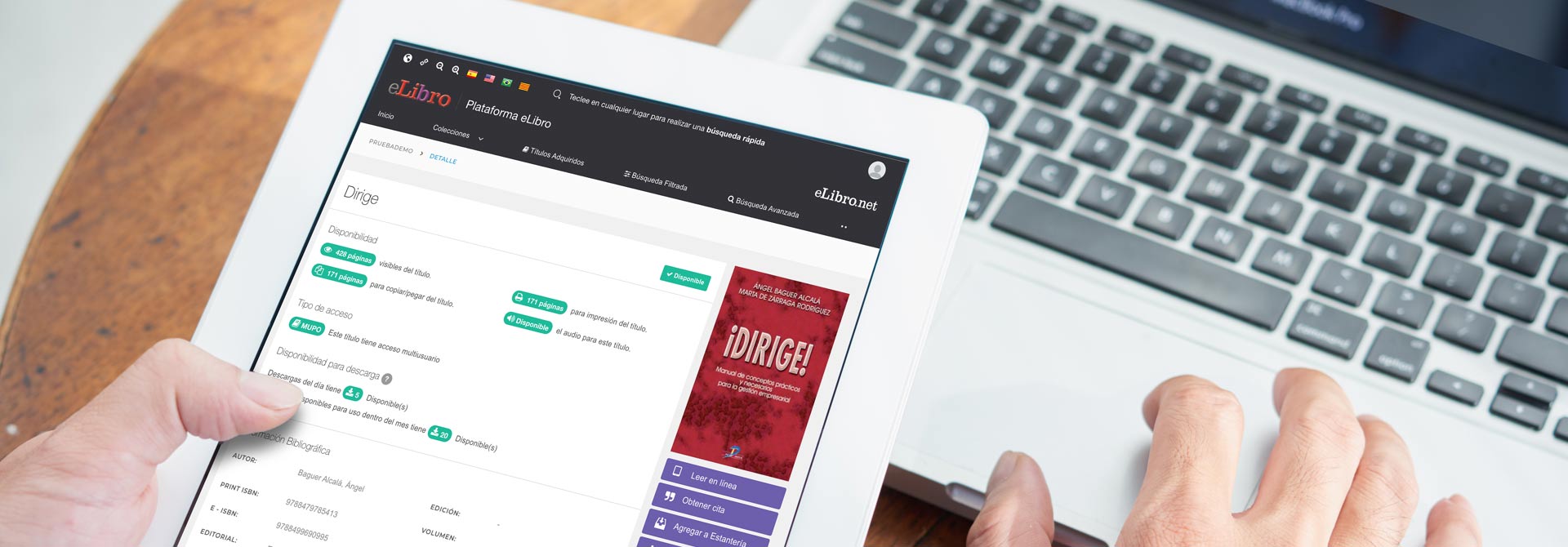 Es una Biblioteca Digital (Plataforma eLibro), especialmente diseñada para Bibliotecas Académicas, en donde los usuarios suscriptos pueden acceder en simultáneo a los textos completos de las publicaciones digitales académicas de más de 800 Editoriales. Se pueden consultar Colecciones en Español, Inglés y Portugués de manera Online y Offline.
