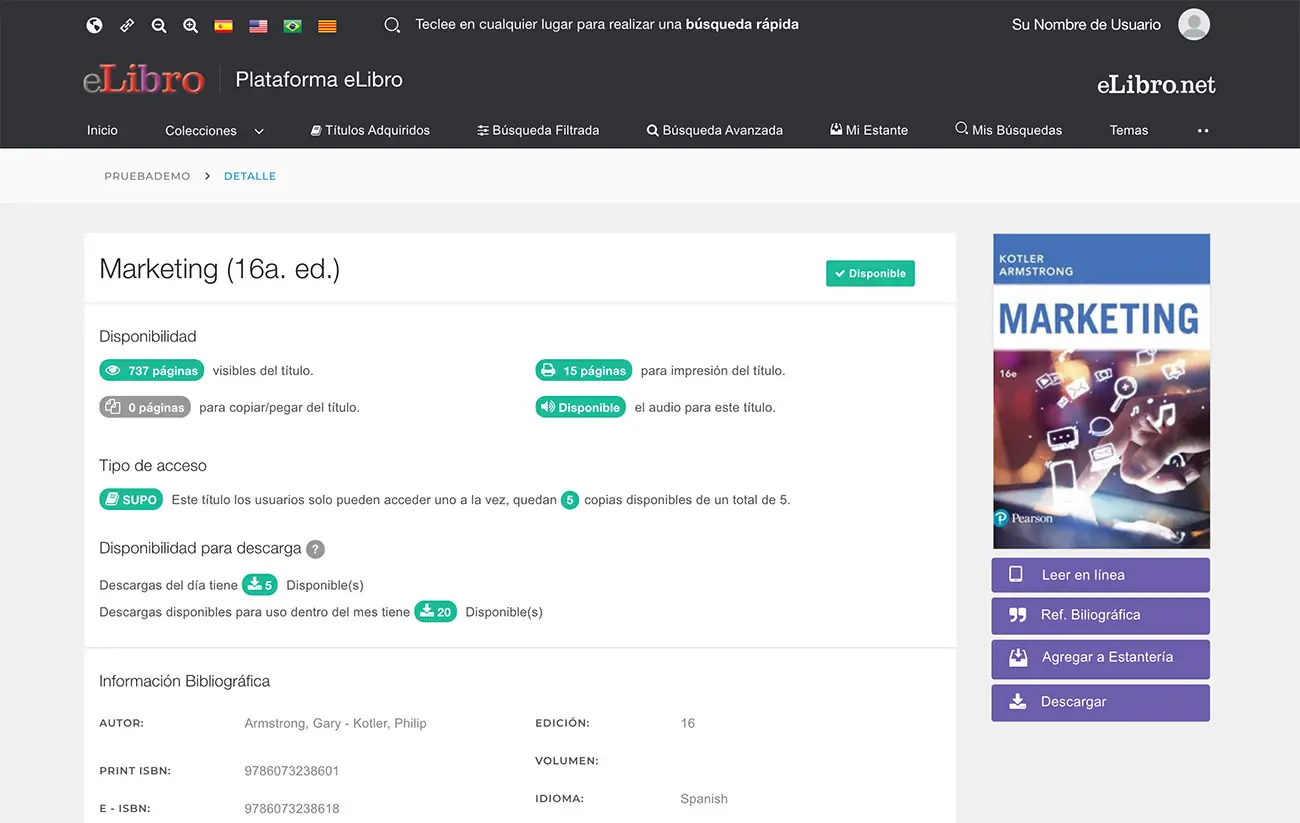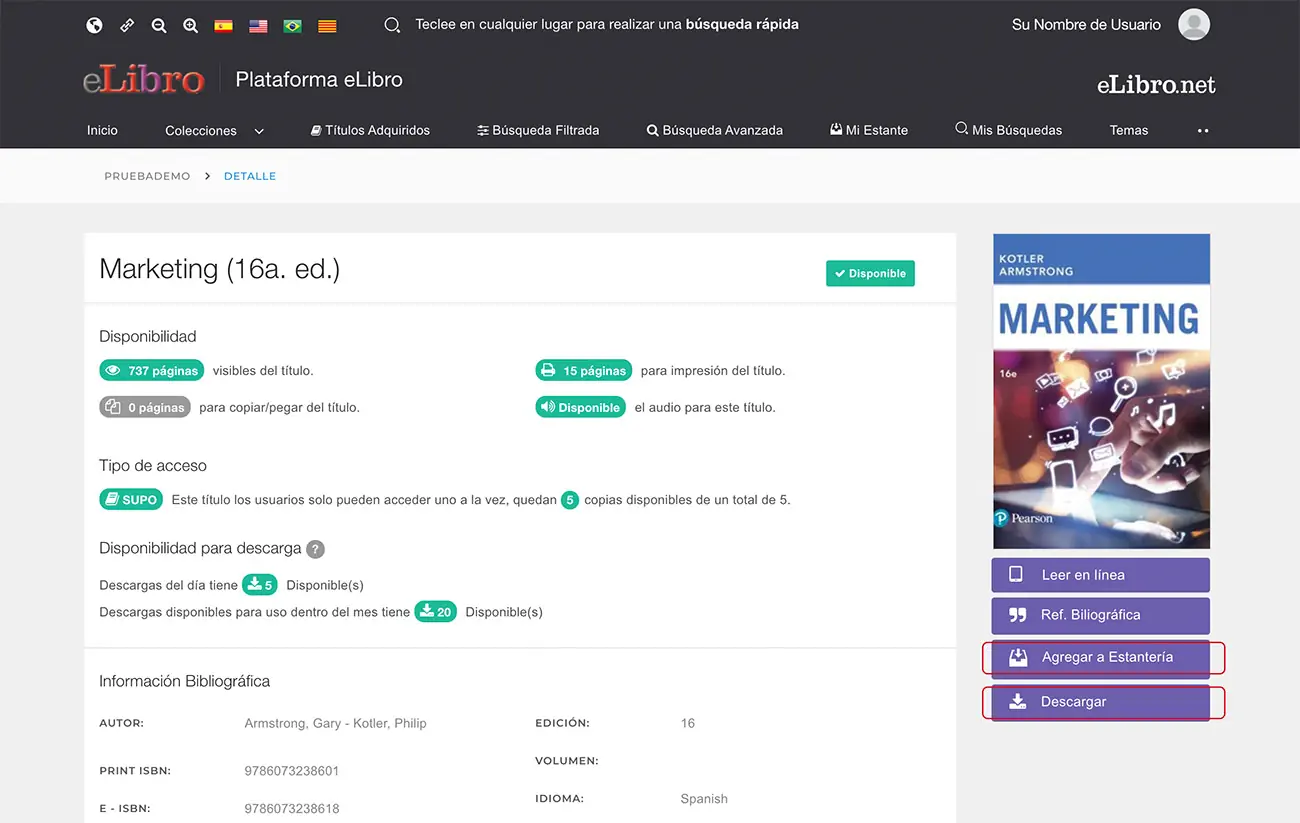 La página de detalles provee información acerca de la cantidad de copias que tiene la institución , los permisos de copias/impresión de páginas y si el libro está disponible para la lectura en línea y/o la descarga completa.