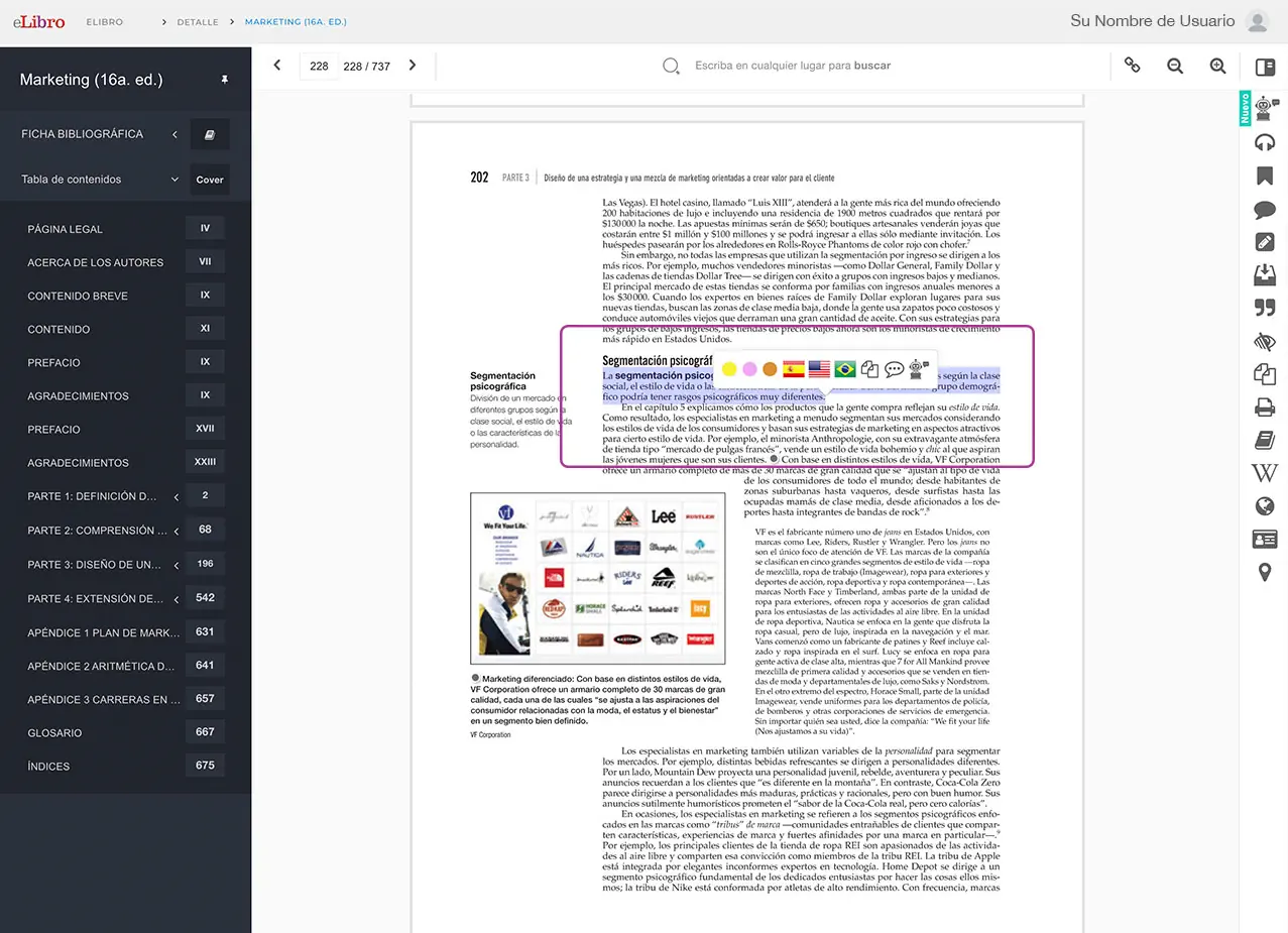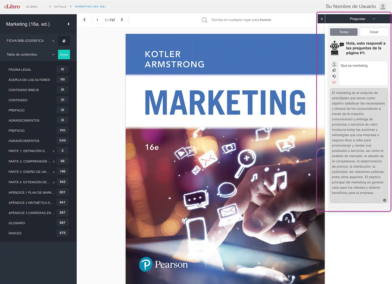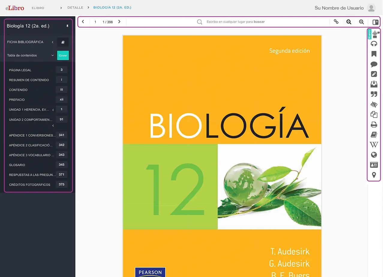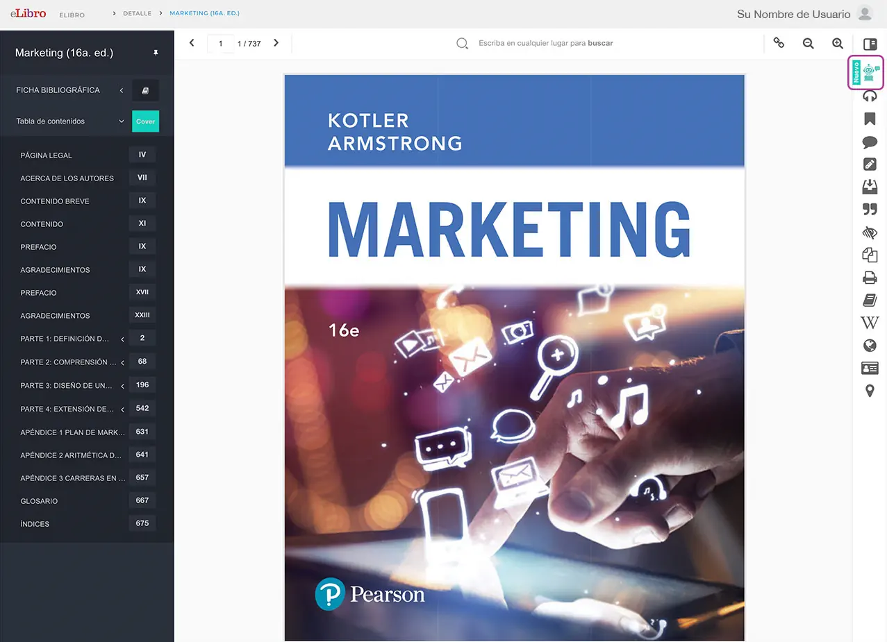 La barra de la derecha: Preguntar a eLi (Inteligencia artificial), escuchar audio, agregar marcadores, agregar notas, sombrear, agregar a estantería, obtener la referencia bibliográfica, ver en modo resumen, copiar, imprimir páginas, busar en diccionario, en wikipedia, traducir, buscar biografías y mapas.