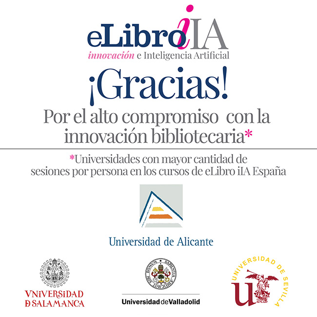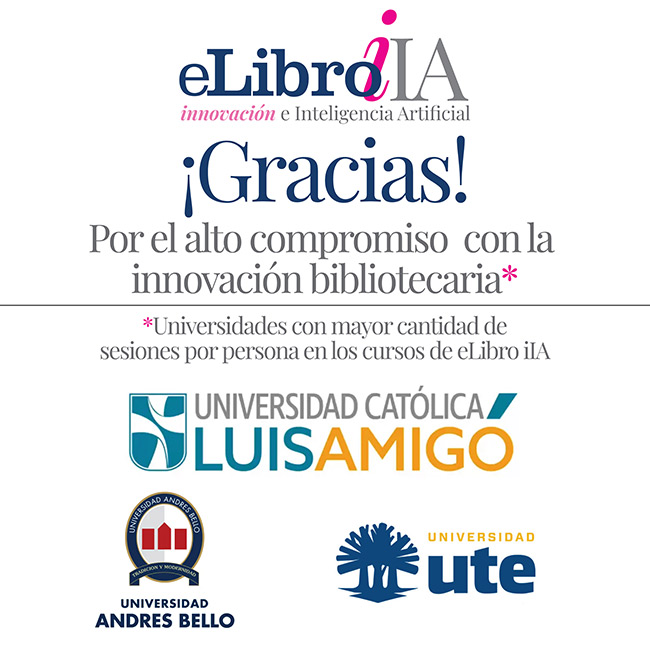 En la Unidad iIA de eLibro creemos que la tecnología importa, pero lo esencial son las personas que aprenden, cuestionan y comparten. Por eso celebramos a las universidades latinoamericanas que han participado con más sesiones por persona en nuestros micro-cursos gratuitos y certificados: Universidad Católica Luis Amigó, Universidad Andrés Bello y Universidad UTE y a las universidades de España: Universidad de Alicante, Universidad de Salamanca, Universidad de Valladolid y la Universidad de Sevilla. Su constancia habla de un verdadero compromiso con la innovación bibliotecaria, la alfabetización crítica en IA y el servicio a sus comunidades.